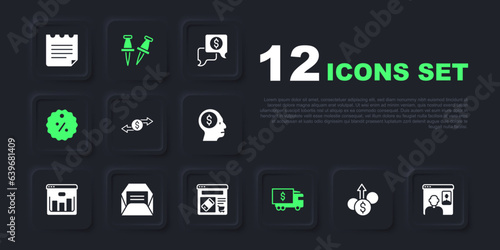 Set Financial growth dollar, Video chat conference, Money exchange, Armored truck, Discount percent tag, Envelope, Push pin and Online shopping screen icon. Vector