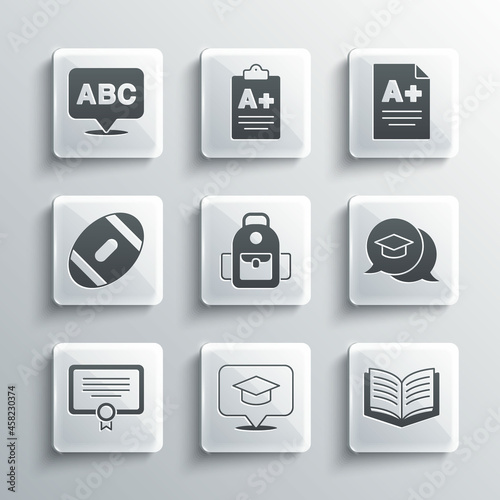 Set Graduation cap in speech bubble, Open book, School backpack, Certificate template, American Football ball, Alphabet and Exam sheet with plus grade icon. Vector