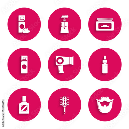 Set Hair dryer, Hairbrush, Mustache and beard, Glass bottle with pipette, Aftershave, Shaving gel foam, Cream or lotion cosmetic jar and icon. Vector