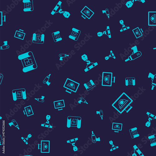 Set House plan, Electric drill machine, Crane hook and Worker safety helmet on seamless pattern. Vector