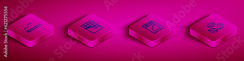Set Isometric line Cigarette, Chocolate bar, Coffee paper filter and beans icon. Vector