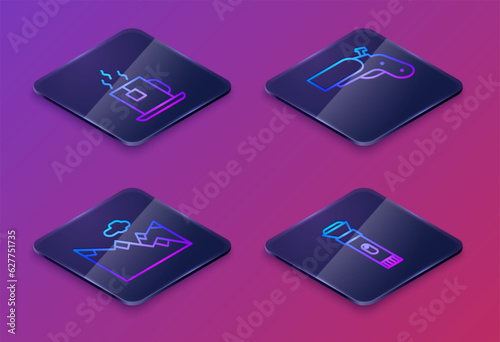 Set Isometric line Cup of tea with tea bag, Mountains, Flare gun pistol and Flashlight. Blue square button. Vector