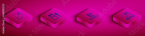 Set Isometric line Eggplant, Jar of honey and dipper stick, Bare tree and Waterproof rubber boot icon. Vector