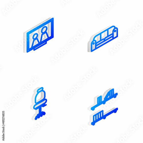 Set Isometric line Sofa, Picture frame on table, Office chair and Shelf with books icon. Vector