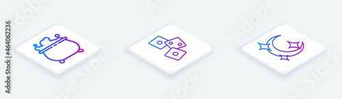 Set Isometric line Witch cauldron, Game dice and Moon and stars. White square button. Vector