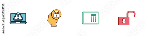 Set Laptop with exclamation mark, Human head lock, Safe and Open padlock icon. Vector