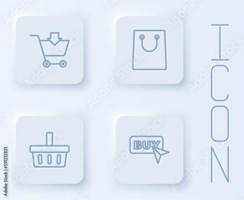 Set line Add to Shopping cart, Paper shopping bag, basket and Buy button. White square button. Vector