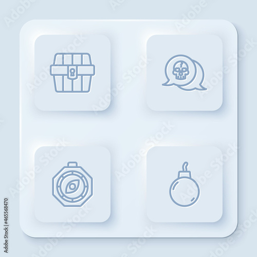 Set line Antique treasure chest, Skull, Compass and Bomb ready to explode. White square button. Vector