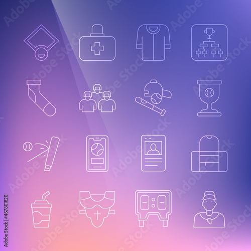 Set line Baseball coach, Sport bag, Award cup with baseball, t-shirt, Team of players, sock, field and bat hat icon. Vector