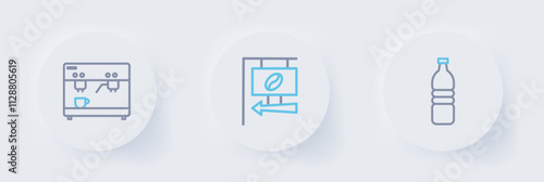 Set line Bottle of water, Street signboard coffee and Coffee machine icon. Vector