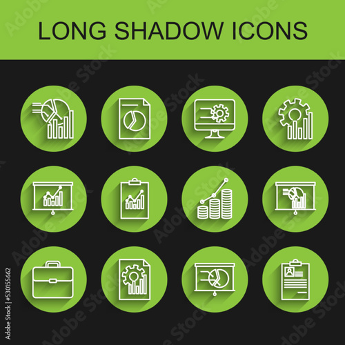 Set line Briefcase, Document with graph chart, Pie infographic, Board, Clipboard resume, and and coin icon. Vector