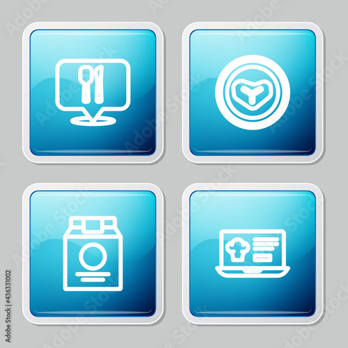 Set line Cafe and restaurant location, Steak meat plate, Online ordering delivery and icon. Vector
