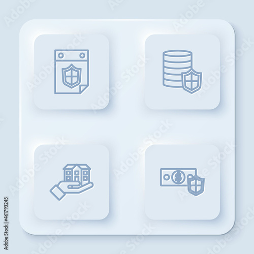 Set line Calendar with shield, Money, House in hand and . White square button. Vector