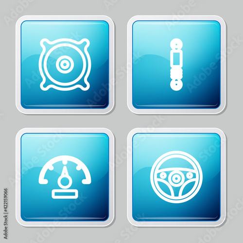 Set line Car audio speaker, Shock absorber, Speedometer and Steering wheel icon. Vector