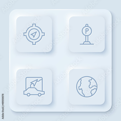 Set line Compass, Parking, City map navigation and Earth globe. White square button. Vector