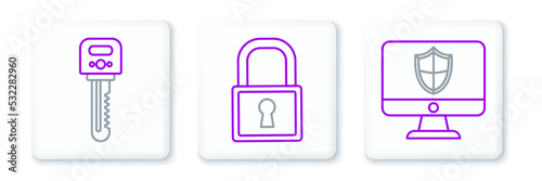 Set line Computer monitor and shield, Key and Lock icon. Vector