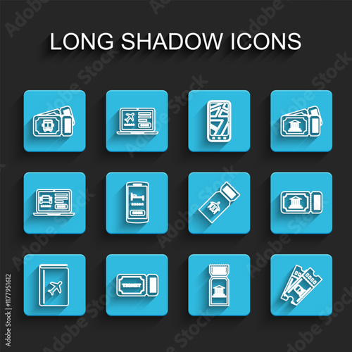 Set line Cover book travel guide, Ticket, Bus ticket, Museum, Train, Online hotel booking, and Airline icon. Vector