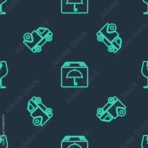 Set line Delivery package with umbrella, tracking and Fragile broken glass on seamless pattern. Vector
