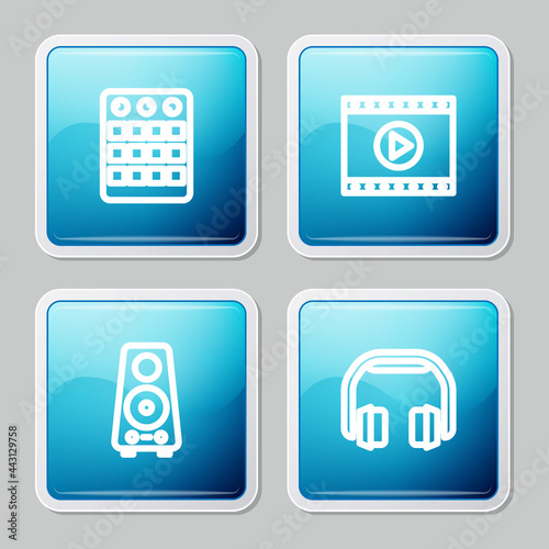 Set line Drum machine, Online play video, Stereo speaker and Headphones icon. Vector