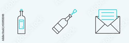 Set line Envelope with invitation card, Bottle of wine and Champagne bottle icon. Vector
