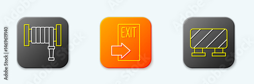 Set line Fire hose reel, exit and Road barrier icon. Vector