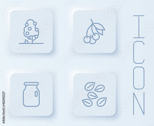 Set line Fruit tree, Fresh berries, Glass jar with screw-cap and Seeds of specific plant. White square button. Vector