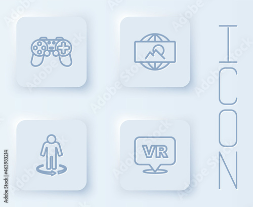 Set line Gamepad, Wide angle picture, 3d modeling and Virtual reality. White square button. Vector