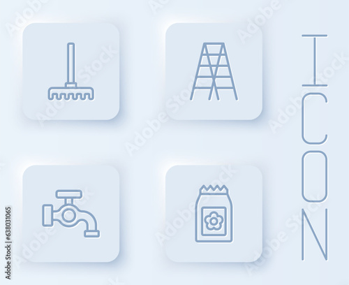 Set line Garden rake, Wooden staircase, Water tap and Pack full of seeds. White square button. Vector