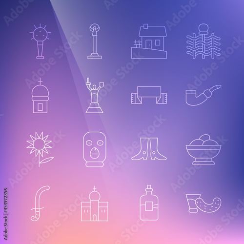 Set line Glass with vodka, Varenyky in bowl, Smoking pipe, Ukrainian house, Mother Motherland monument, Church tower, Mace and Embroidered towel icon. Vector