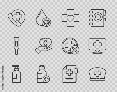 Set line Hand sanitizer bottle, Nurse hat with cross, Heart, Bottle of medicine syrup, Emergency phone call to hospital, Medical prescription pen and Map pointer icon. Vector
