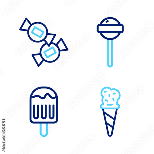 Set line Ice cream in waffle cone, Lollipop and Candy icon. Vector
