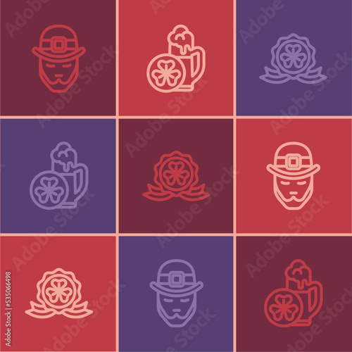 Set line Leprechaun, Medal with clover and Glass of beer icon. Vector