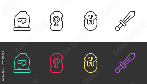 Set line Magic rune, Viking head and Medieval sword on black and white. Vector