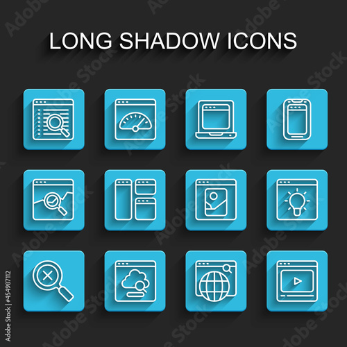 Set line Magnifying glass and delete, Cloud technology data transfer, Search engine, Online play video, Browser window, and Photo retouching icon. Vector