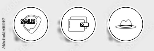 Set line Man hat with ribbon, Telephone 24 hours support and Wallet icon. Vector