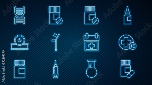 Set line Medicine bottle and pills, Cross hospital medical, Crutch or crutches, Otolaryngological head reflector, DNA symbol, Doctor appointment and icon. Vector