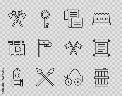 Set line Medieval throne, Wooden barrel, Decree, parchment, scroll, Crossed medieval spears, axes, flag, four-wheel cart and icon. Vector