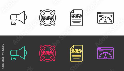 Set line Megaphone, SEO optimization, and Website statistic on black and white. Vector