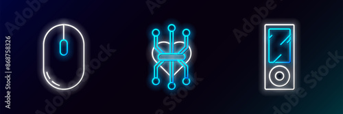 Set line Music player, Computer mouse and Processor icon. Glowing neon. Vector