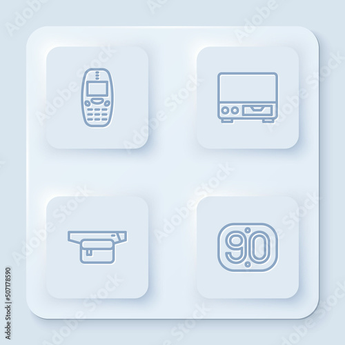 Set line Old mobile phone, video cassette player, Waist bag of banana and 90s Retro. White square button. Vector