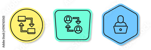 Set line Online working, Project team base and Freelancer. Colored shapes. Vector