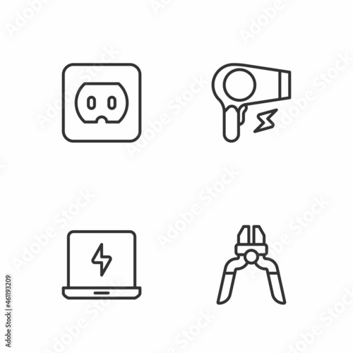 Set line Pliers tool, Laptop, Electrical outlet and Hair dryer icon. Vector