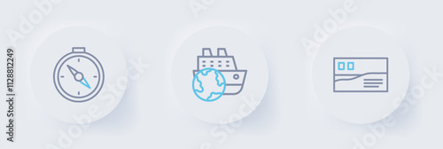 Set line Postcard travel, Cruise ship and Compass icon. Vector
