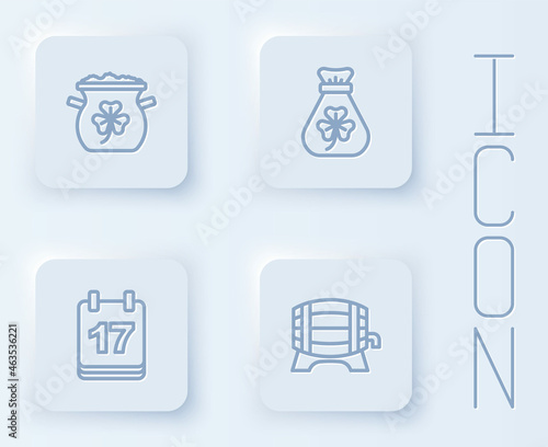 Set line Pot of gold coins, Money bag with clover, Saint Patricks day calendar and Wooden barrel rack. White square button. Vector