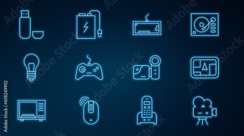Set line Retro cinema camera, Gps device with map, Keyboard, Gamepad, Light bulb concept of idea, USB flash drive, Cinema and Power bank charge cable icon. Vector