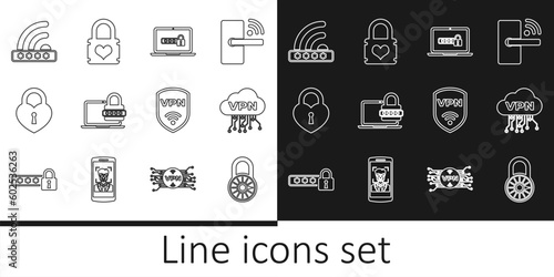 Set line Safe combination lock wheel, Cloud VPN interface, Laptop with password, Castle the shape of heart, Wifi locked, Shield wireless and Padlock icon. Vector