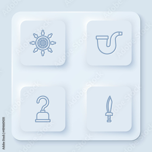 Set line Ship steering wheel, Smoking pipe, Pirate hook and sword. White square button. Vector