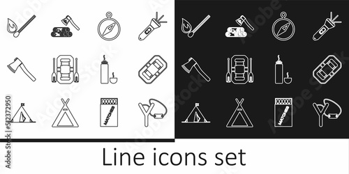 Set line Slingshot, Rafting boat, Compass, Wooden axe, Burning match with fire, Thermos container and and wood icon. Vector