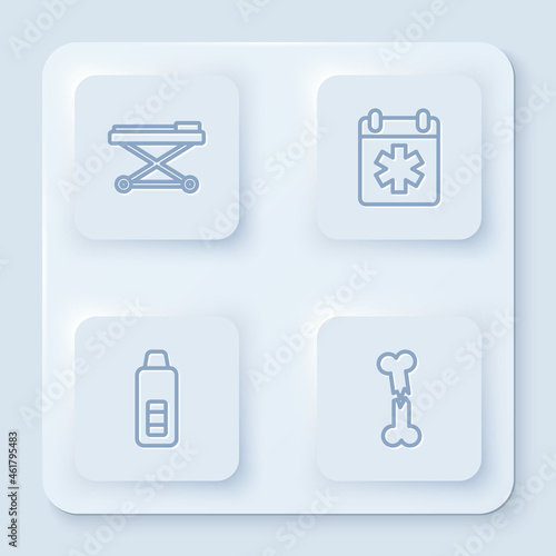 Set line Stretcher, Doctor appointment, Digital thermometer and Human broken bone. White square button. Vector