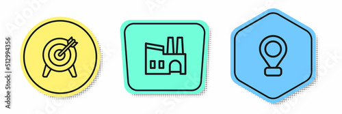 Set line Target, Factory and Location. Colored shapes. Vector